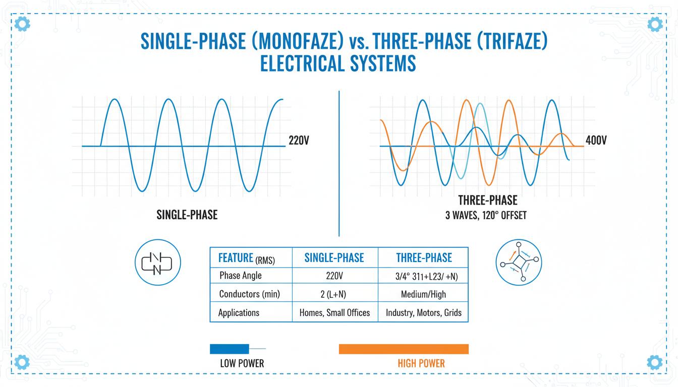 Elektrik enerjisinin iletimi, güç kapasitesi ve stabilite ihtiyacına göre iki temel model üzerinden gerçekleştirilir. Monofaze sistemler evsel konfor odaklıyken, trifaze sistemler yüksek performanslı endüstriyel operasyonlar için tasarlanmıştır.